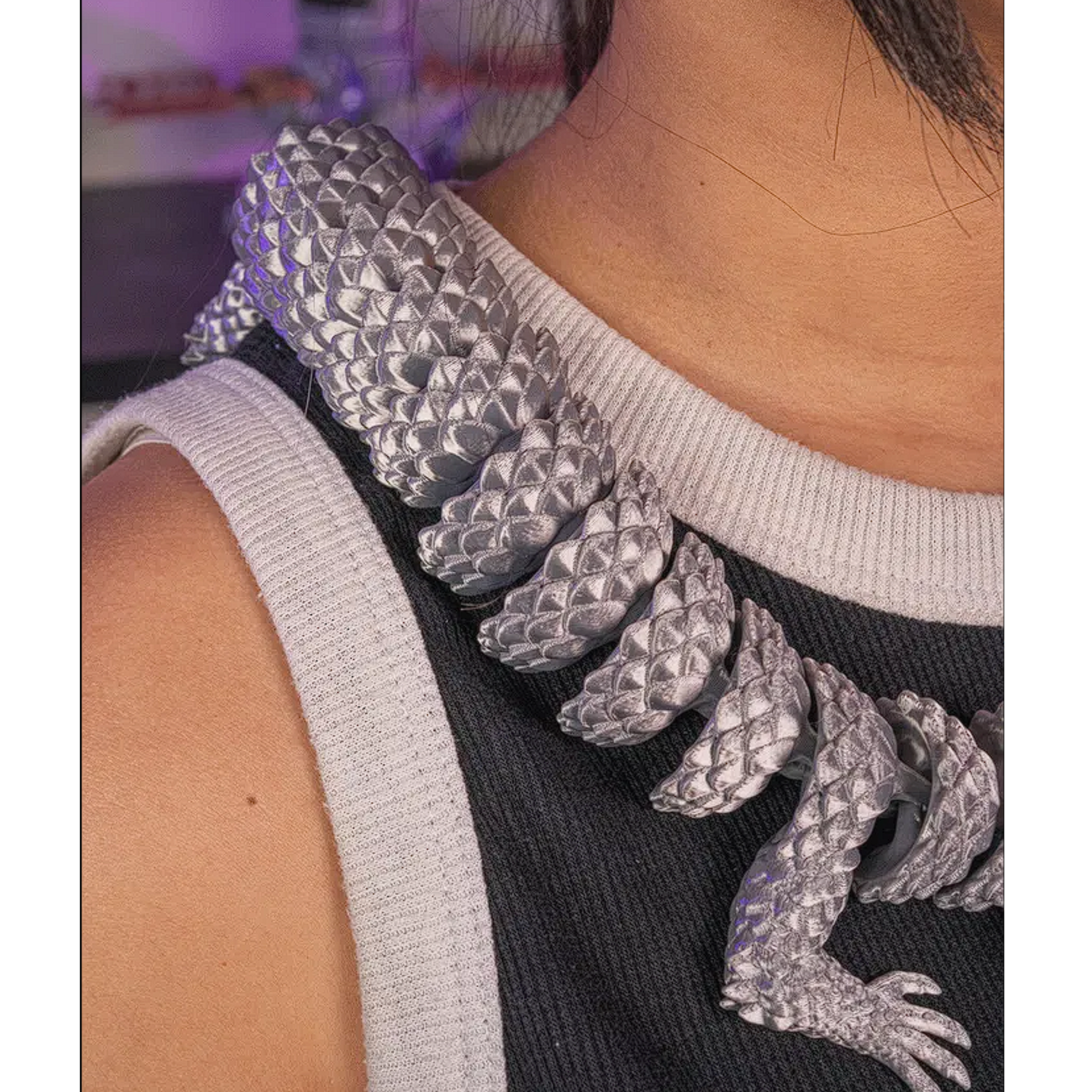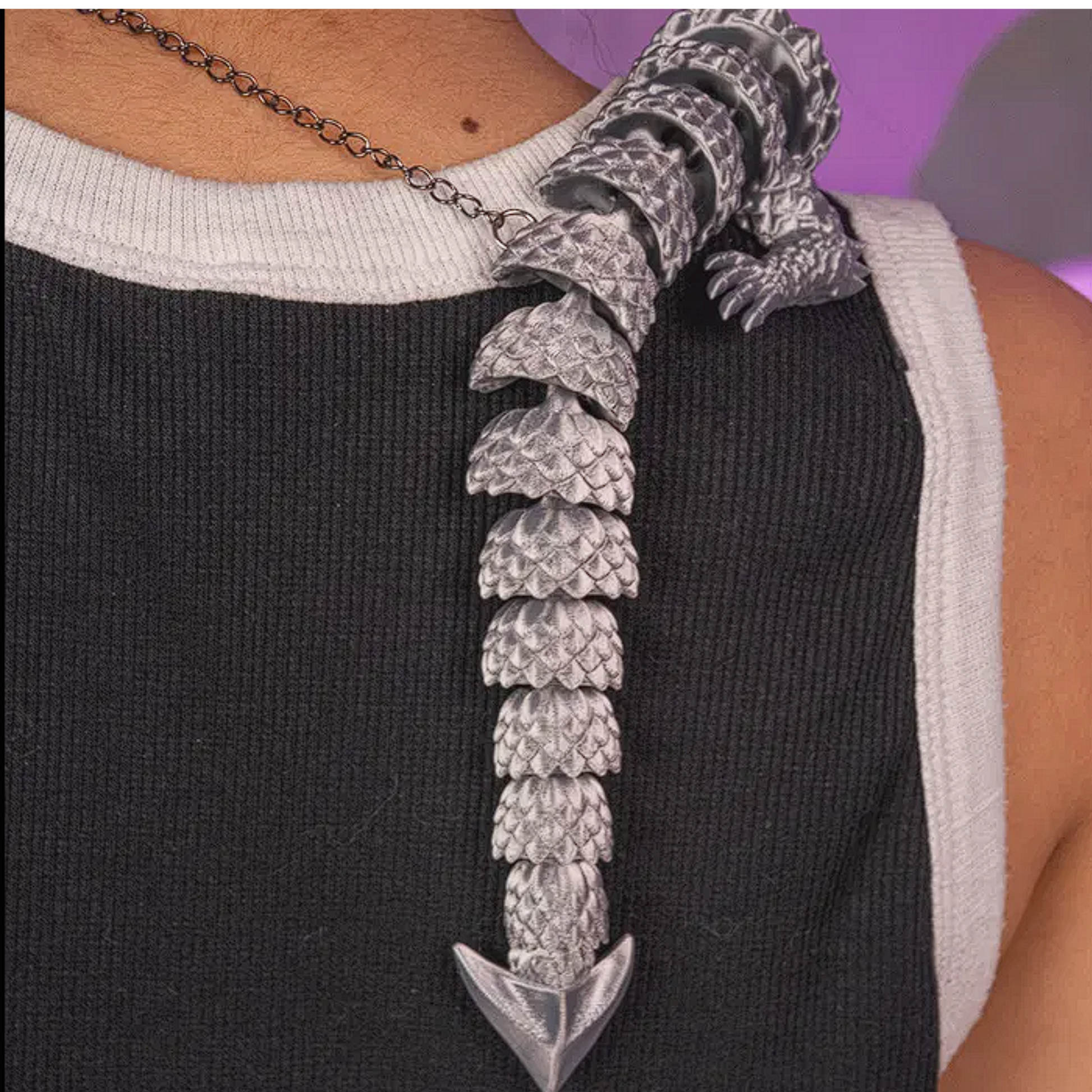 This striking piece features a fully articulated dragon design that wraps elegantly around the neck. Crafted with high-quality 3D printing technology, the flexible segments allow for natural movement and a comfortable fit. The metallic silver finish is accented by piercing red eyes, making this a true statement piece.